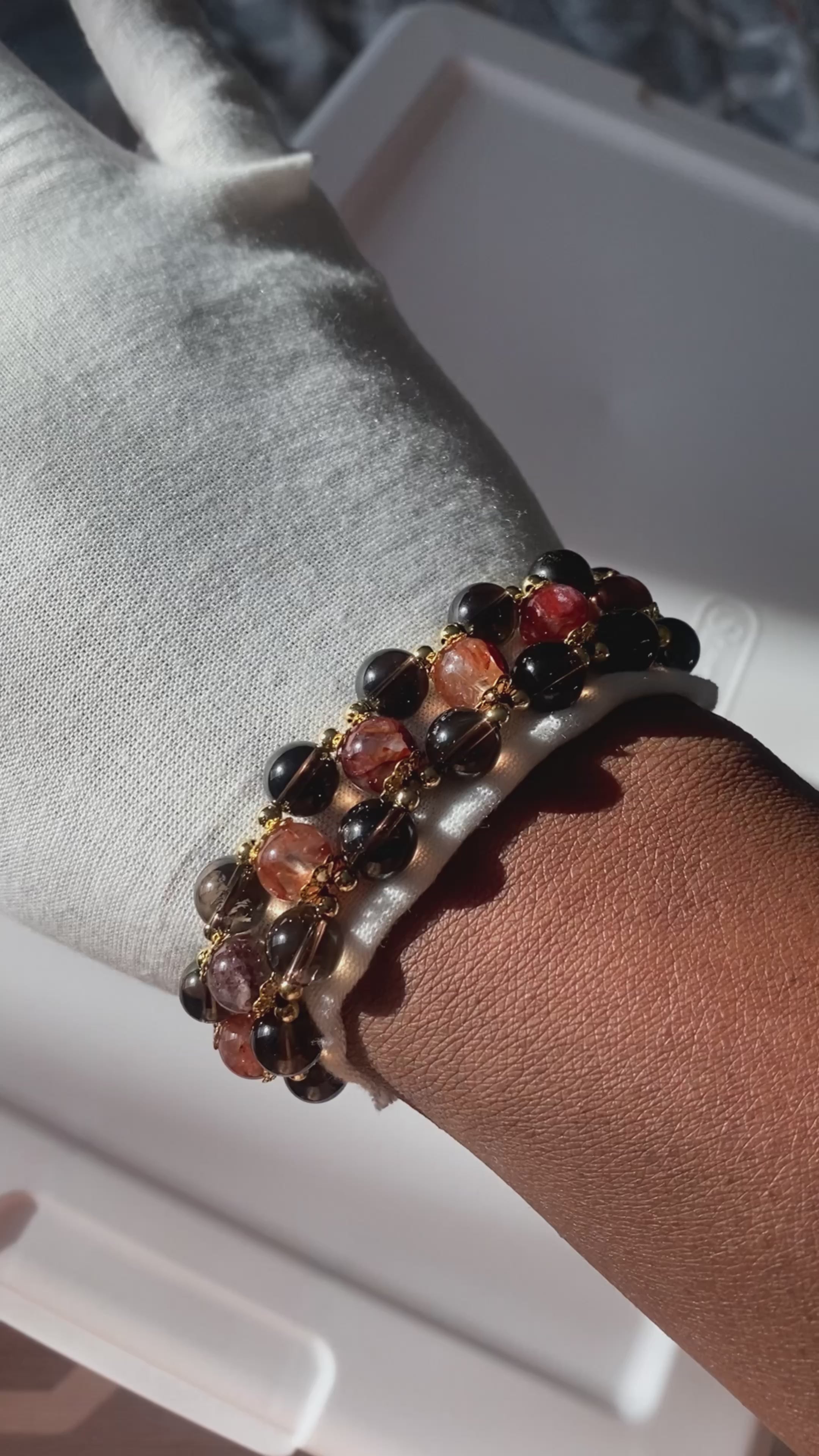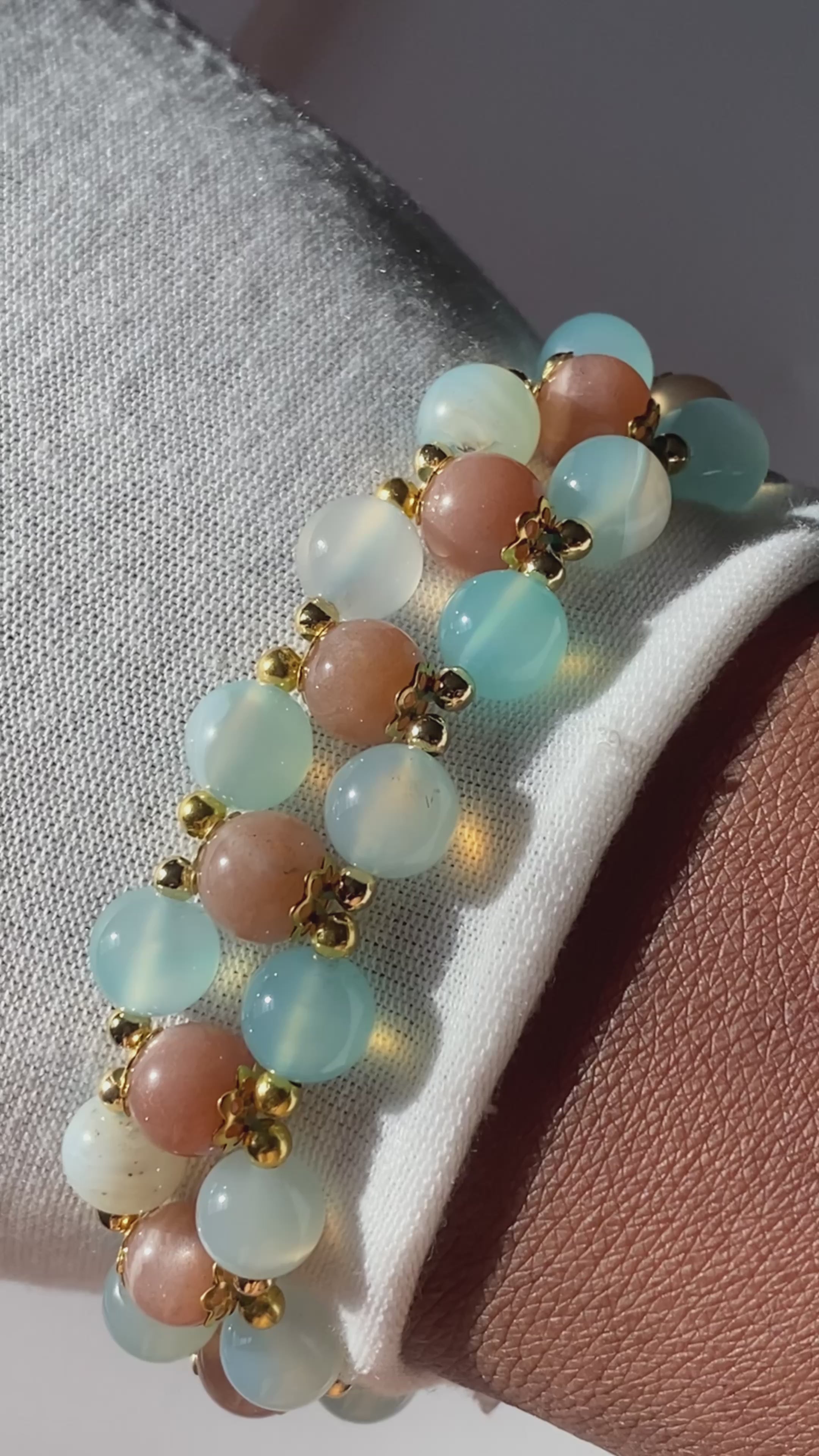 Each bracelet symbolizes woven connections between spirit and universe. Gems like Amethyst, Rose Quartz, and Turquoise are hand chosen for specific properties. Properties that enhance energy flow through Chakras, providing: Protection, Clarity, and Courage.