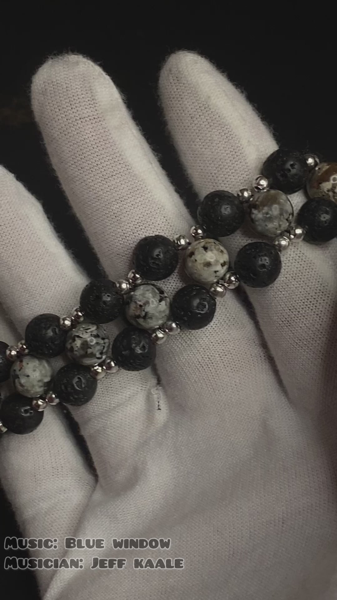 Cinturón de asteroides : El cinturón de asteroides es una llamativa pieza de joyería que combina la robustez de la yooperlita y la piedra de lava con la elegancia elegante de la plata. La yooperlita es un tipo de piedra que se encuentra en la península superior de Michigan y que brilla bajo la luz ultravioleta, lo que le da una apariencia de otro mundo. Se dice que esta piedra se formó a partir del impacto de un meteorito hace millones de años, lo que la convierte en un complemento perfecto para la pulsera del cinturón de asteroides. La piedra de lava, por otro lado, se forma a partir de roca fundida que se ha endurecido en la superficie de la tierra. Esta piedra volcánica no solo agrega un toque terroso a la pulsera, sino que también tiene una textura rugosa que contrasta maravillosamente con la suavidad de la plata. La combinación de yooperlita, piedra de lava y plata crea una pieza atrevida y masculina que es perfecta para cualquier hombre. Cada piedra es única en su color y patrón, lo que hace que cada pulsera sea única. El contraste entre los tonos oscuros y terrosos de las piedras y las cuentas de plata brillante agrega profundidad y dimensión a la pulsera. La pulsera Asteroid Belt seguramente agregará un toque de estilo e intriga al atuendo de cualquier hombre.